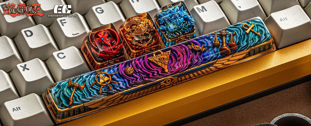 Every official Yu-Gi-Oh! artisan keycap is packed with detail, from the blazing aura of Slifer the Sky Dragon, to the golden might of The Winged Dragon of Ra, the overwhelming force of Obelisk the Tormentor, and the divine mystery of the Millennium Items Space Bar.